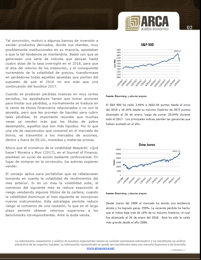 Para el momento en que se escribió este reporte, el S&P 500 indicador por excelencia del desempeño del mercado accionario estadounidense había caído 8%, en relación a su máximo de todos los tiempos, de 2.865 punto alcanzado el 26/01/2018.
