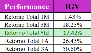 IGV rastrea un índice ponderado, que mide el rendimiento de las acciones cotizadas en EE.UU., de la industria del software y empresas seleccionadas de las industrias de entretenimiento y medios interactivos de servicios en los EE.UU., y Canadá. También incluye empresas que son productoras de aplicaciones cliente/servidor; software empresarial; de la aplicación; de entretenimiento para el hogar; y de medios y servicios. Redistribuye su cartera de gigantes como Microsoft a compañías de software más pequeñas y orientadas al crecimiento. Se incluyen las empresas canadienses, pero constituyen solo una pequeña parte de la cartera.
